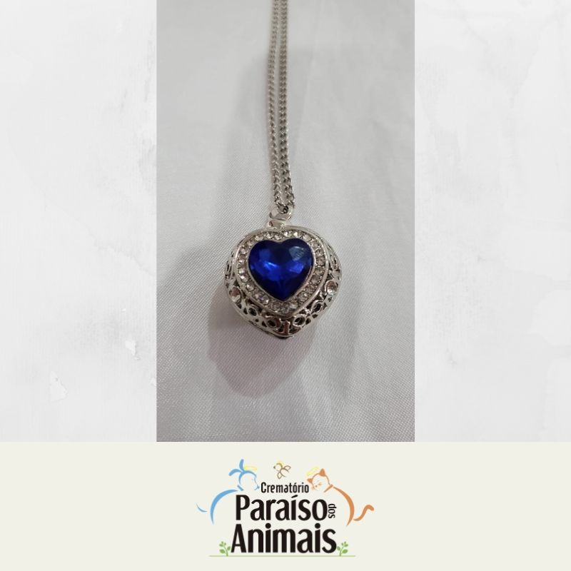 Um lindo pingente cinerário com formato de coração em pedraria azul.